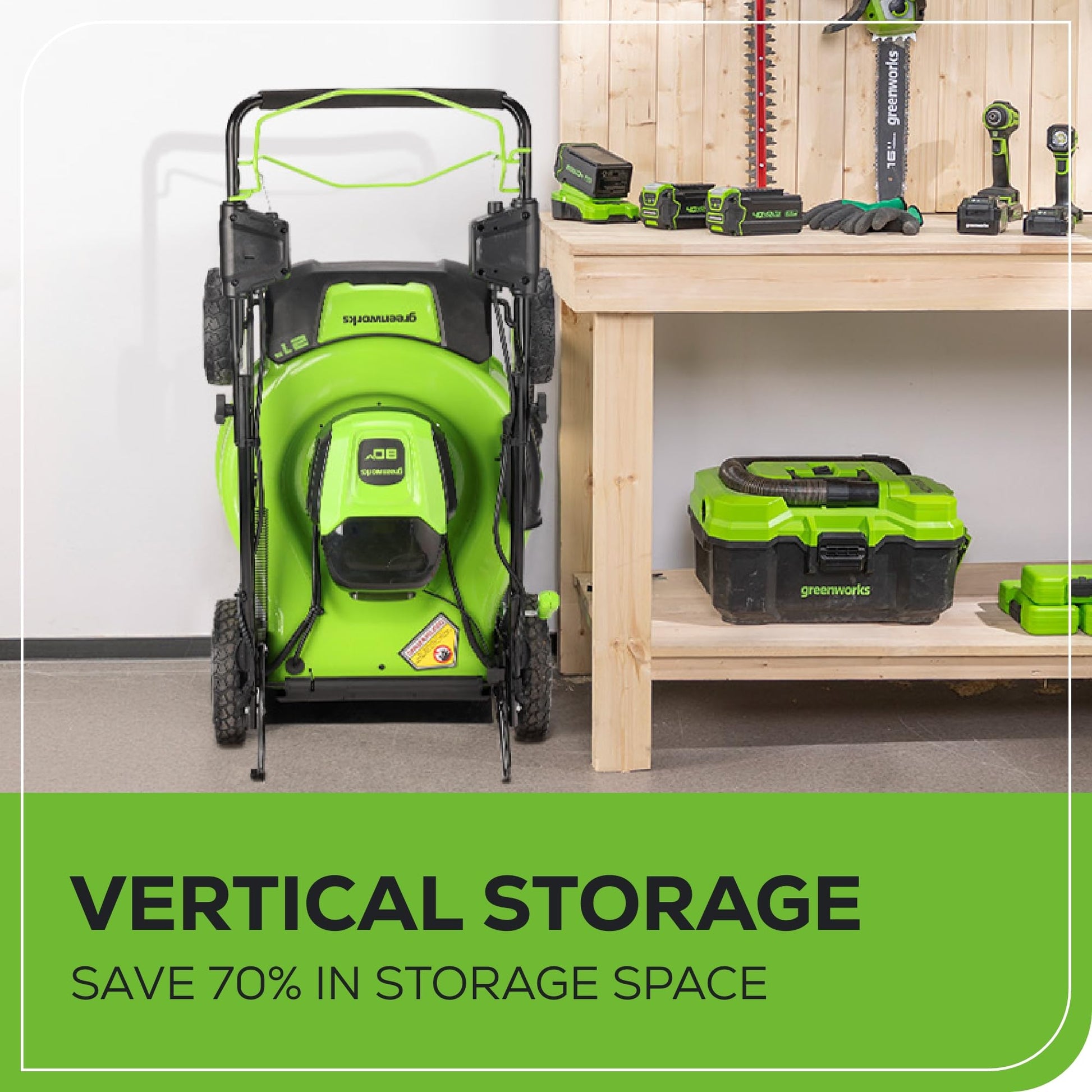 - MAINTENANCE FREE – This self-propelled lawn mower is virtually maintenance free, with no gas, no oil, and no emissions. Push button start, quiet operation, and delivers gas-like performance. Use up to 70% less space in your garage with vertical storage